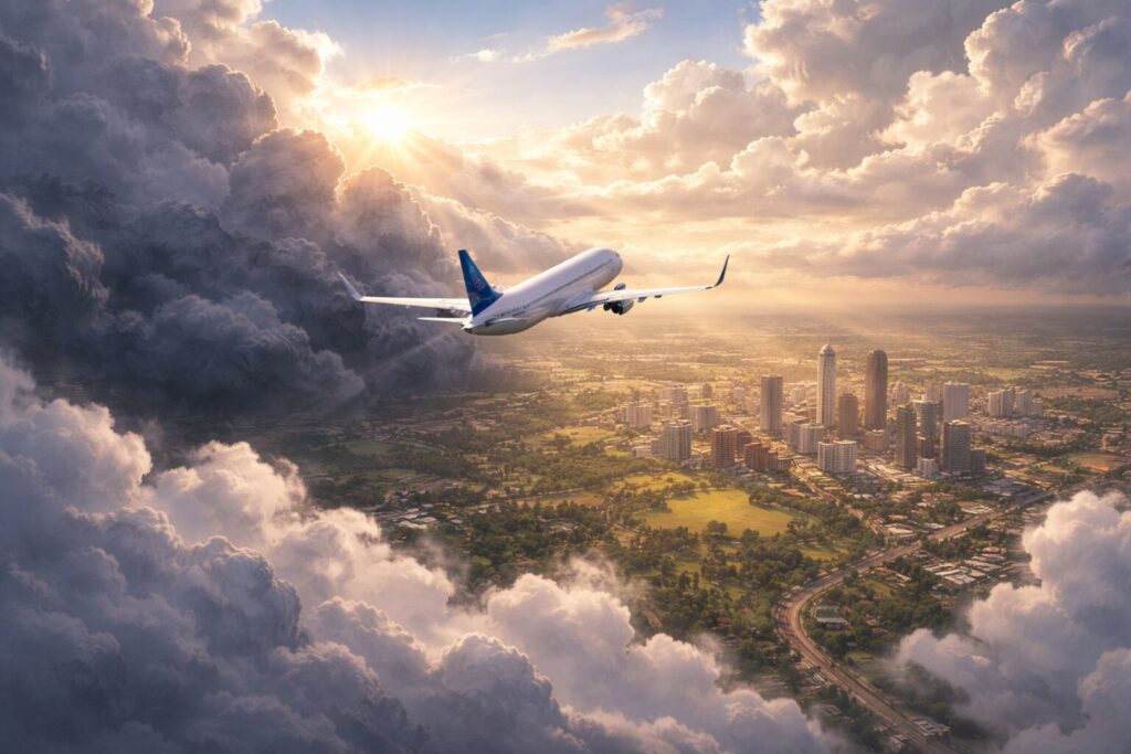 As if in answer to my prayers, the dark clouds soon parted. The plane hovered steadily over the city and landed on the rough tarmac without further scare.