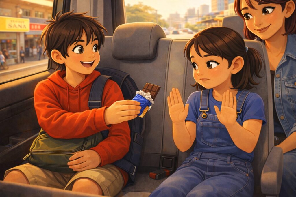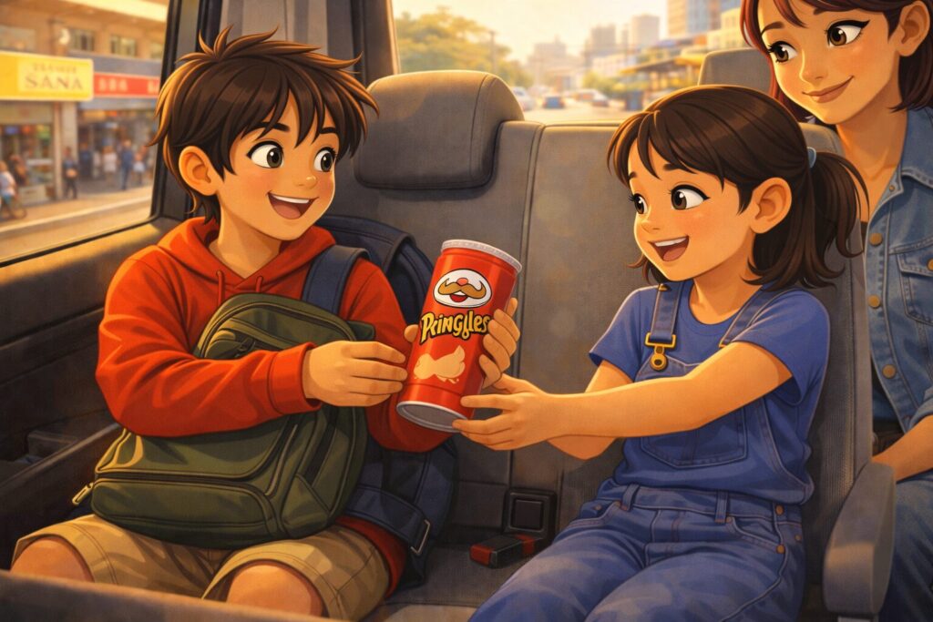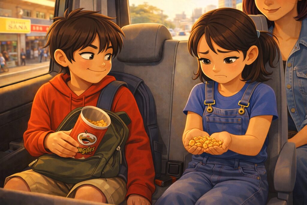 I had only two packets of chips—we couldn’t pack much. One was broken, and the other was perfect. No way was I giving her the good one. So I handed over the damaged box, hoping she wouldn’t mind. But her frown said it all.