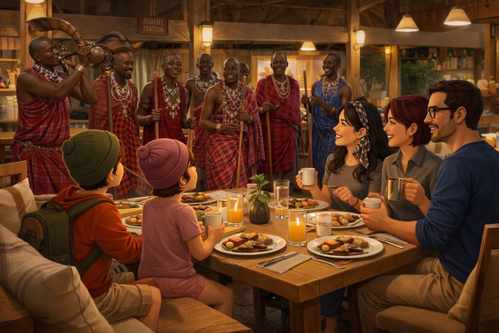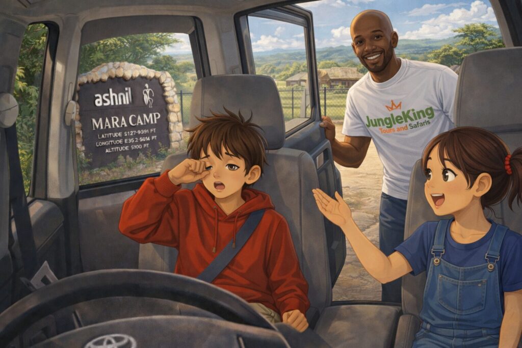 Someone shook me awake. The car was parked beside others on a gravel road. A wooden sign read “Ashnil Mara Camp.”