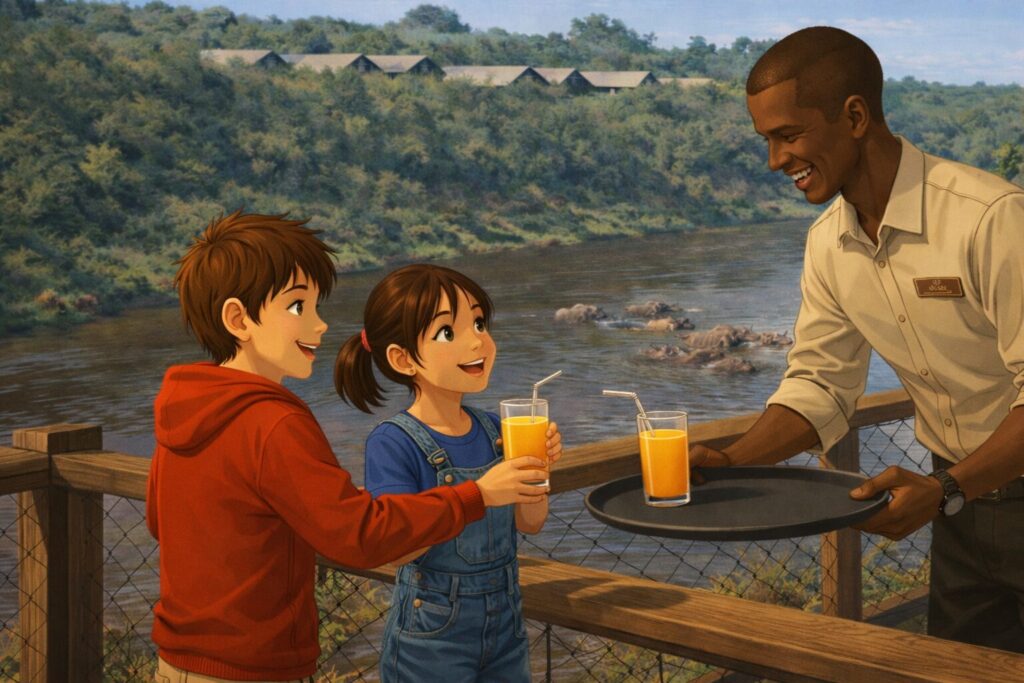 Ashnil Mara Camp was delightful. Snaking pathways led to cottages nestled in the forest. Near the reception was a lawn overlooking the Mara River. While the adults checked in, Rani and I walked to the river deck.