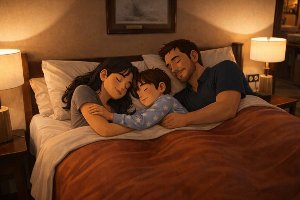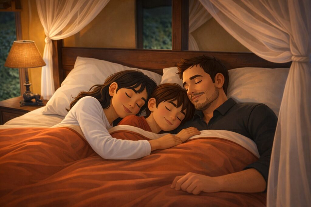 Then we were allowed to enter. I went straight to the wooden lounge chair, untied my shoes, and went to pee. Then I washed my hands and jumped on the cozy mattress. Mom and Dad were tired too, so they freshened up and snuggled inside — Mom to my left and Dad to my right.