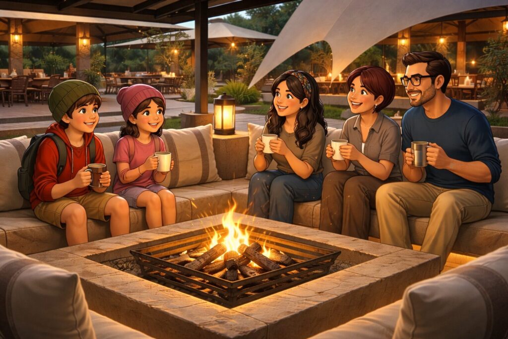 Then we drove fast to the resort, where it was chilly cold. We went to the lounge deck straight across the reception and took some evening hot beverages and settled around a freshly lit bonfire. It was an amazing ambience. There was soft music playing from across the bar. There was a screen open and an African man in traditional Masai attire was explaining to everyone about the Big Five.