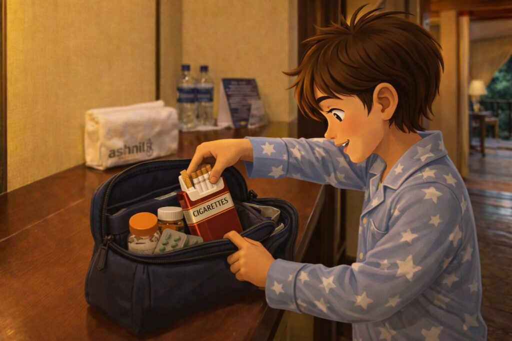 So, having no other option, I sneaked to the wash area, which had open closet rails where my father’s jacket hung. I took out his box of cigarettes and hid it inside Mom’s makeup box — inside the medicine pouch — because it was not used much.
