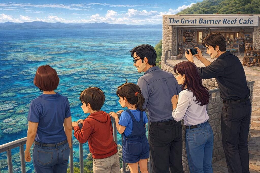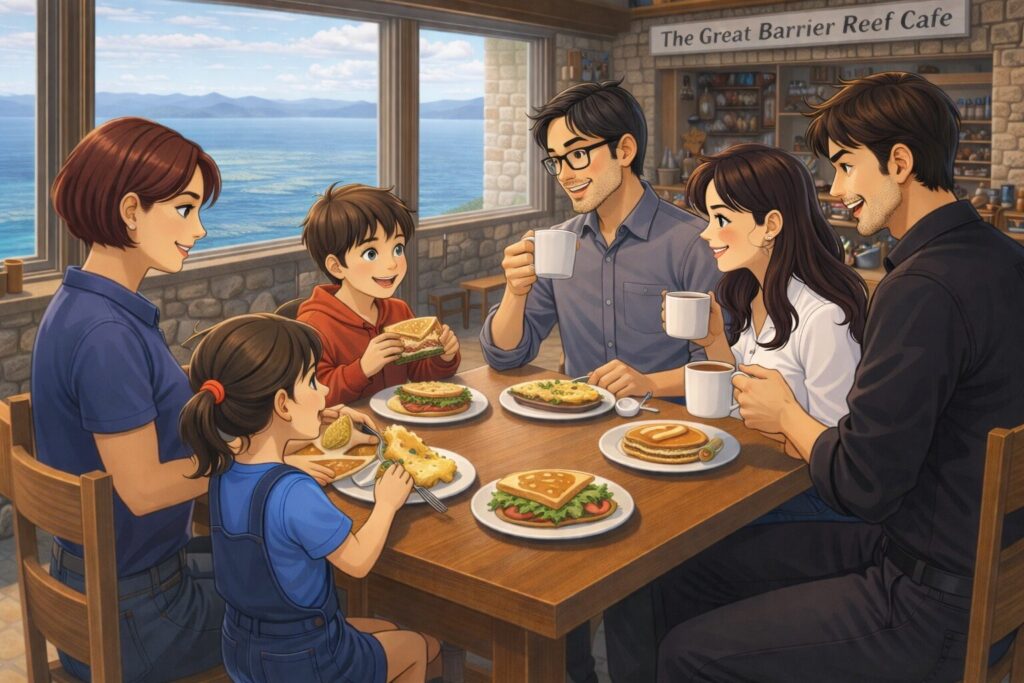 We stopped for breakfast at a café overlooking it and had sandwiches, pancakes, and omelettes. The elders had coffee. I saw Daddy sneak out for a cigarette—something he thought he was hiding from me and Mom.