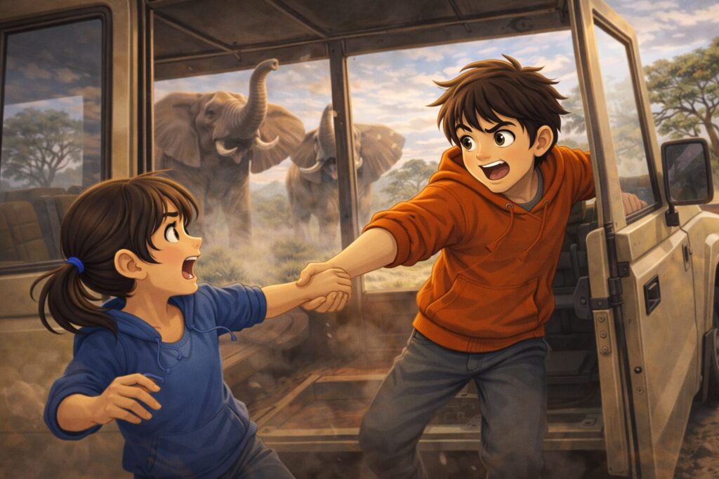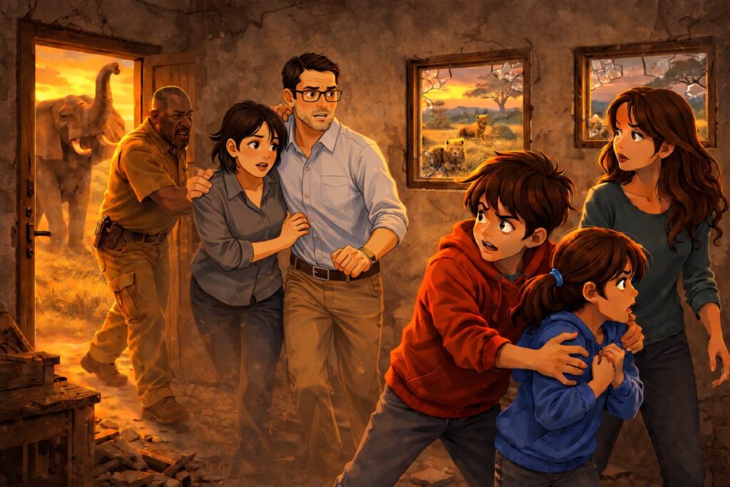 John instructed us to stay calm, but one elephant’s trunk grazed the windshield. With a swing, it could have toppled the vehicle. Rani was nearest the window when instinct kicked in—I grabbed her hand and yanked her away, throwing open the opposite door and sprinting into the nearest crumbling cottage.