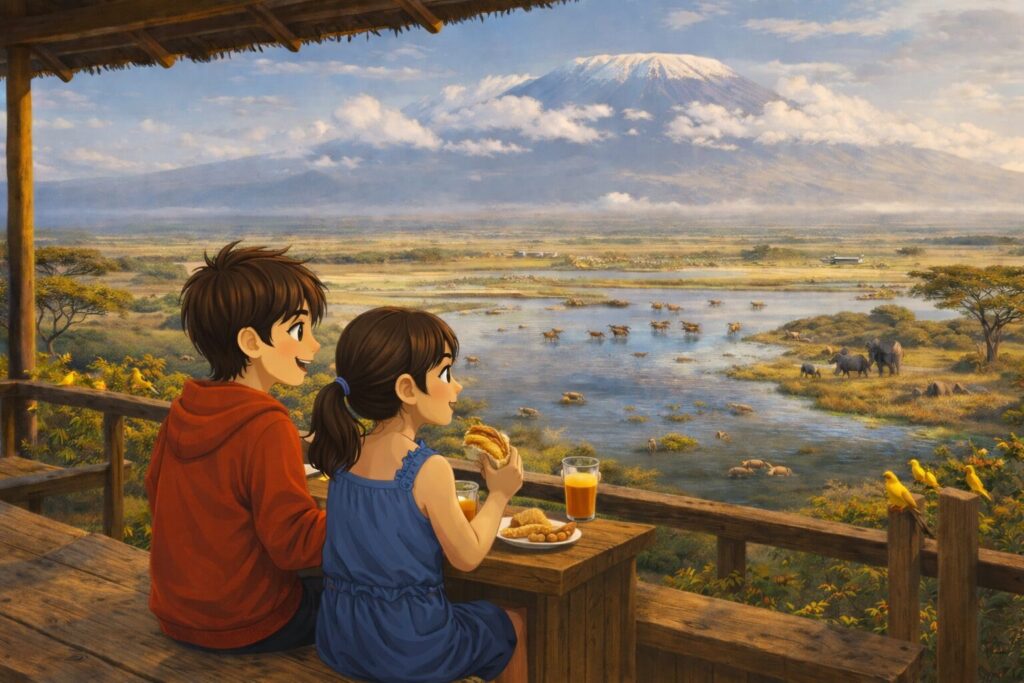 At the peak, we settled on shaded platforms overlooking the savanna. Sandwiches and juice in hand, we waited for the clouds to clear Kilimanjaro’s summit. While we waited, we clicked photos together. Yellow birds chirped, elephants loomed in the distance below, zebras and wildebeests drank at the lake below, and hippos floated lazily in the water. Acacia trees dotted the landscape, and even a far-off airstrip gleamed in the sun. For once, Rani and I shared a moment quietly—no teasing, no whining. It felt strangely nice.