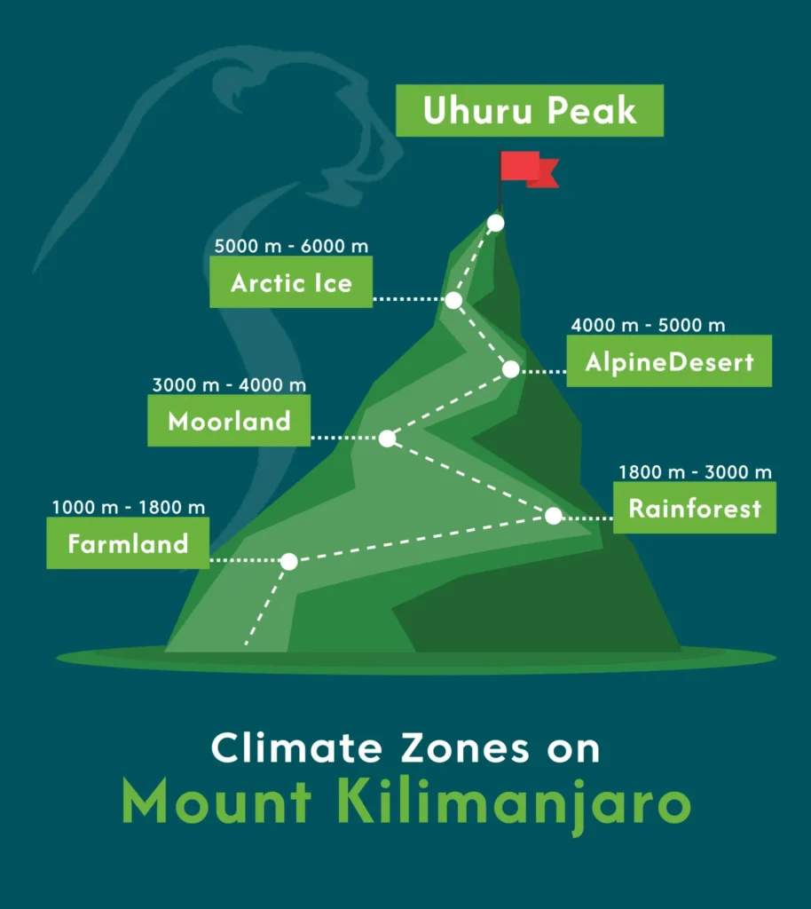 The cultivated base of farmland and villages; the dense rainforest; heath and moorland with hardy shrubs; the rocky alpine desert; and the icy arctic summit, capped with snow even at the equator.